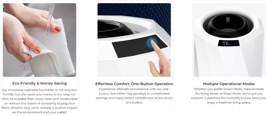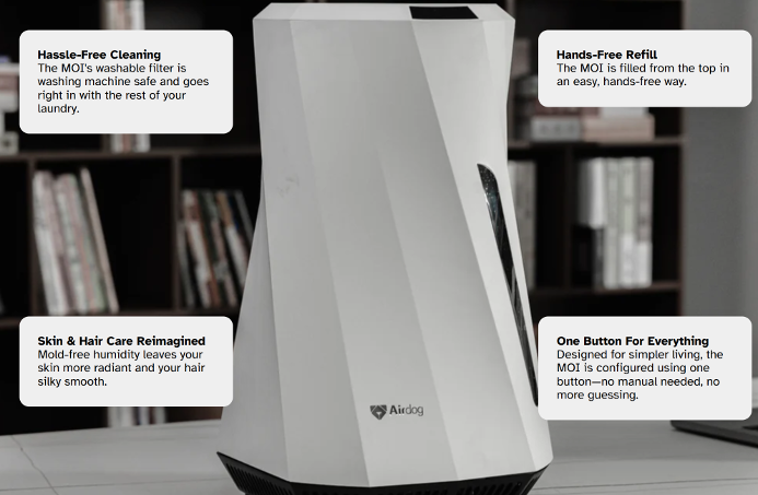 Airdog MOI Germicidal Mold-Free Evaporative HumidifierA NEW Kind of Humidifier: Airdog has developed the world’s first germicidal mold-free evaporative humidification system that produces uniform indoor humidification without all the common downsides of ultrasonic humidifiers. Traditional ultrasonic humidifiers produce mist, water droplets, white mineral powder, which will result in wet floors/walls—a perfect breeding mold/bacteria in the long term. The MOI is the perfect answer to these problems with cold evaporative technology where water naturally evaporates in the air, and moisture evaporation is spread into the air through circulating fans. Thus, MOI ensures constant humidity output across the room without any of the mist or hassle.
